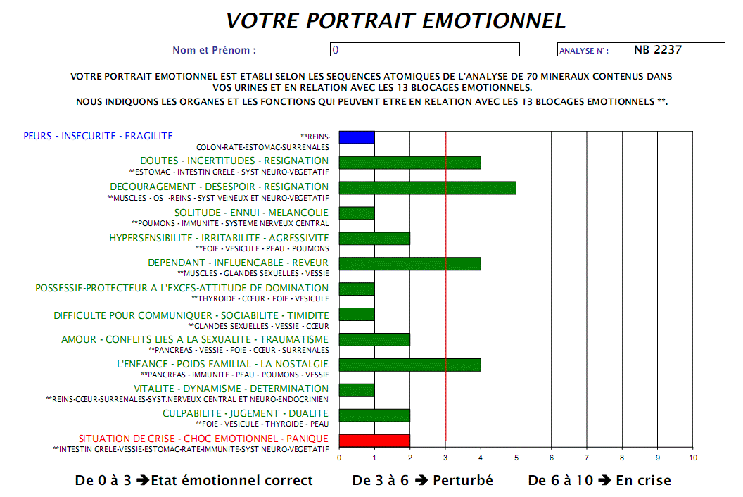 Nous pouvons alors retraduire l’analyse d’urine, ce que nous faisons par un programme informatique, grâce auquel nous allons indiquer les faiblesses organiques. Les différents organes sont alors évalués sur une échelle de 0 à 10, comme dans le tableau ci-après. Plus les indices sont proches de 0, plus l’organe correspondant est en bonne santé.